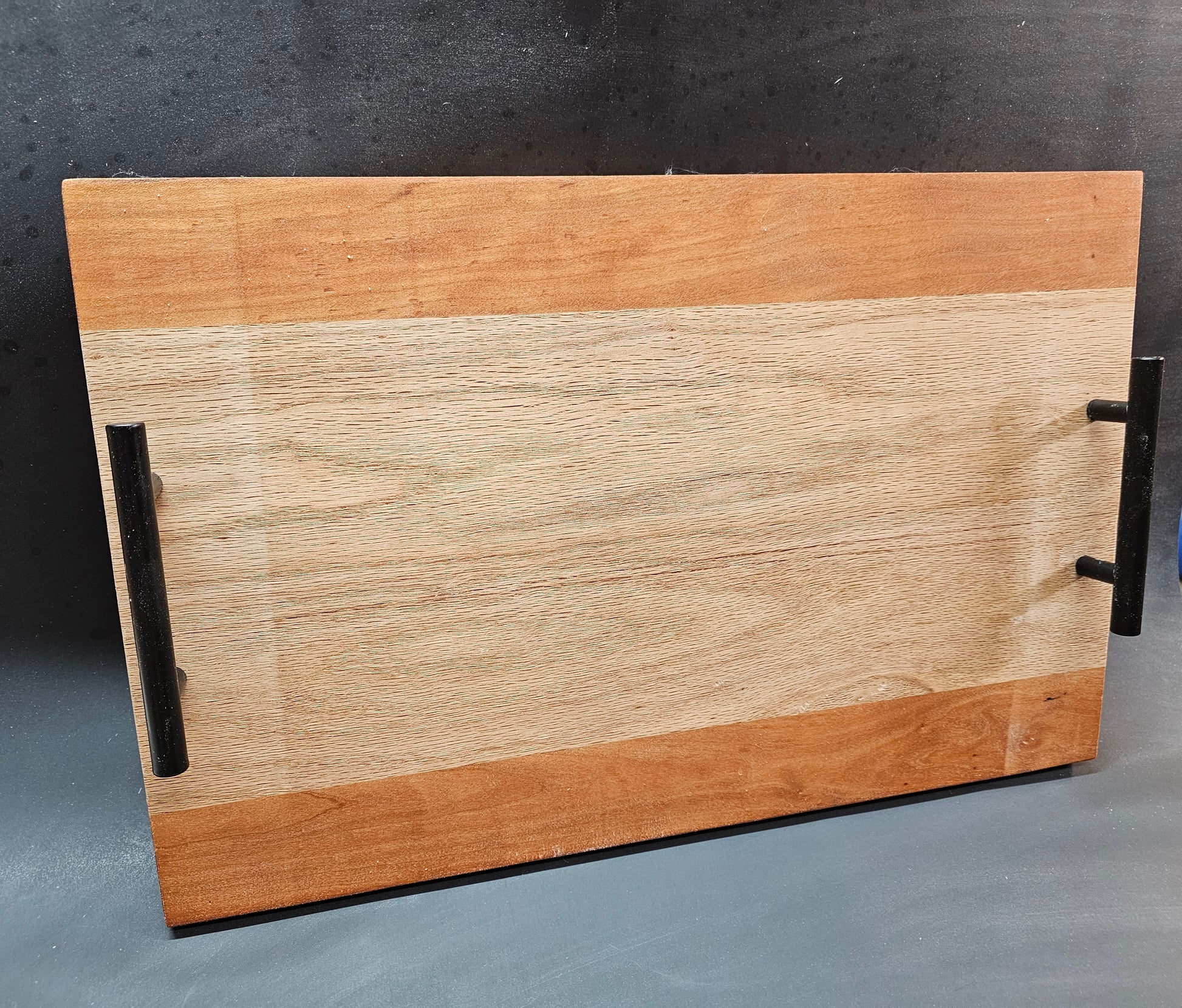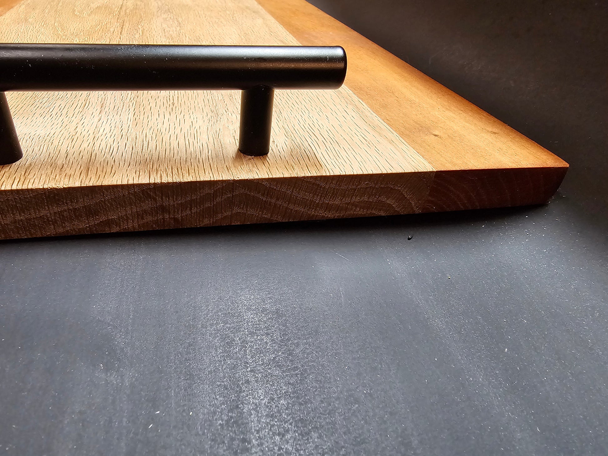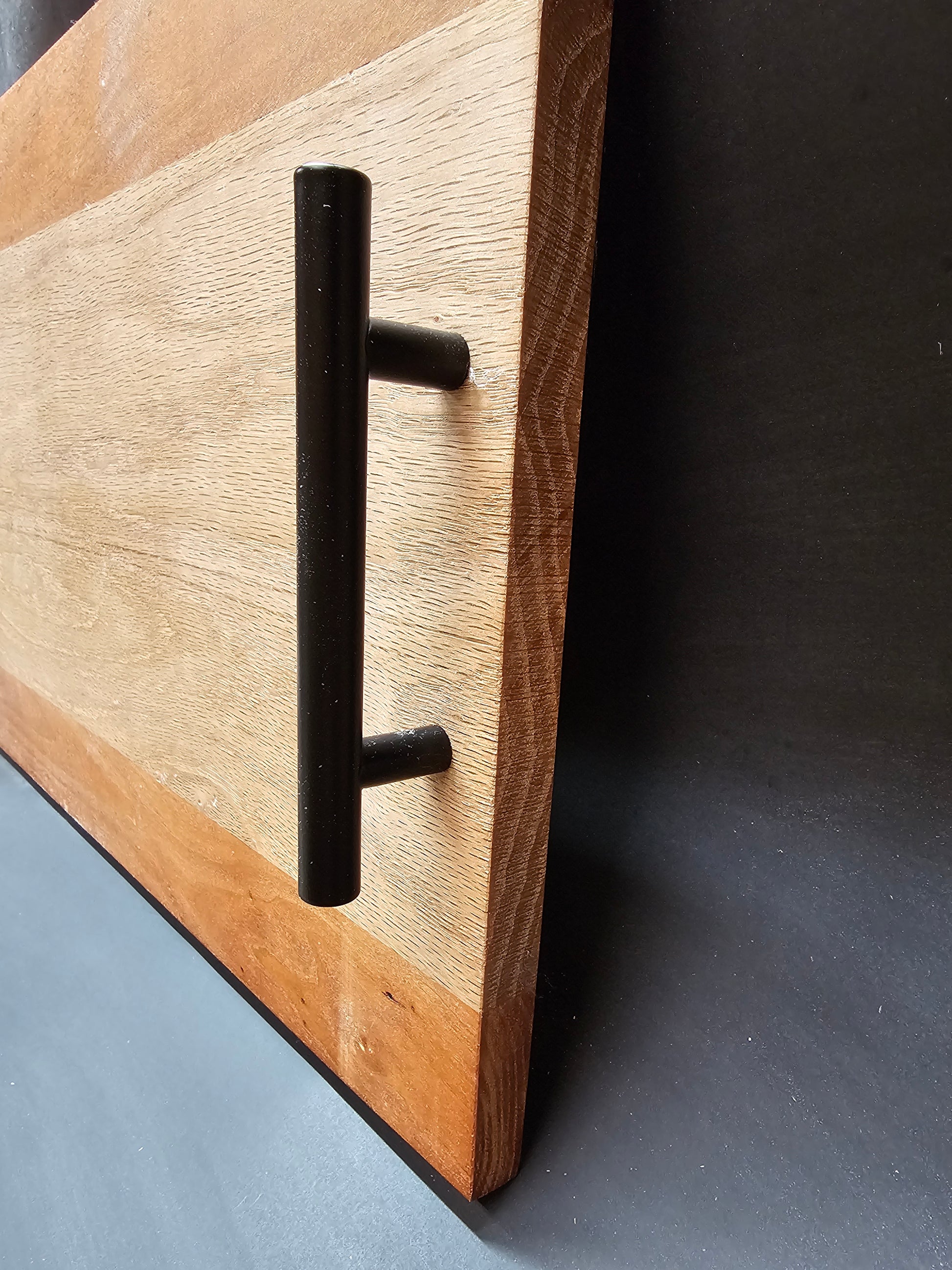 This board is made from white oak and walnut. The handles are steel finished in antique bronze.