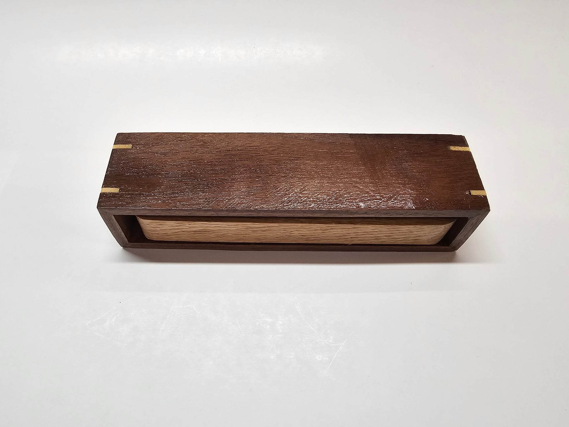 Made from walnut and oak with poplar spline joints on the corners for visual appeal as well as strength, this candle holder can be used as a simple decorative end table candle holder to being used as part of a dinner table center piece.